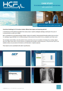 HCF, a comprehensive cloud-based software solution, captures the patient’s data provided through questionnaires as well as the radiology images (DICOM) into the EMR providing an full overview of the patient’s history, symptoms and X-Ray results. The radiologist, based offsite, views the patient’s history and X-Ray online and completes the findings thus creating a digital electronic signed report which could be shared or distributed electronically to authorized parties. Comprehensive reports and statistical analysis are provided to the funders as all information is digitally captured. These reports can be customized to the client’s specifications.
